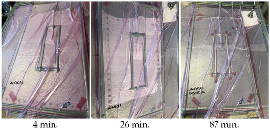 Progress of the infusion at different times. The entry of the resin into the drainage can be seen through the holes in the edge area of the sample (4 min and 26 min). After 87 min, the sample (OOP-ALG-006) is completely impregnated.
