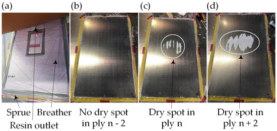 (a) Experimental set-up for out-of-plane infusion. (b) No dry-spots visible in ply n − 2. (c) Dry-spot in ply n. (d) Dry-spot in ply n + 2.