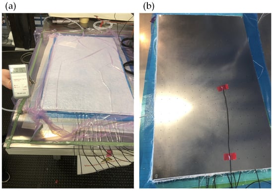 To determine the temperature distribution, the experimental setup is evacuated to a pressure of approx. 200 mbar and heated on the plate mold. In the first test variant, only the lower heating blanket is used for heating and the upper side is insulated. In the second variant, the heating blanket on the upper side is also used for heating. In both tests, the temperature controller is set to 50 °C and no heating ramp is specified. Thermocouple TC01 measures the temperature of the plate mold and thermocouple TC012 measures the temperature on the top side of the laminate (see Figure 5). For all thermocouples, a temperature value is recorded every minute. Figure 9a shows the test setup with the thermocouples taken out and Figure 9b the fixation of a thermocouple in the laminate.
