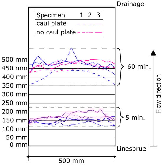 Figure 10 shows the results of the in-plane infusion experiments. For a better overview, the flow fronts are shown only after 5 min and after 60 min. A clear difference between the specimens with caul plate and without caul plate is not evident. Furthermore, even after 60 min infusion time, no flow path longer than 500 mm is observed. The results also show that no race-tracking occurred at the plate edges.