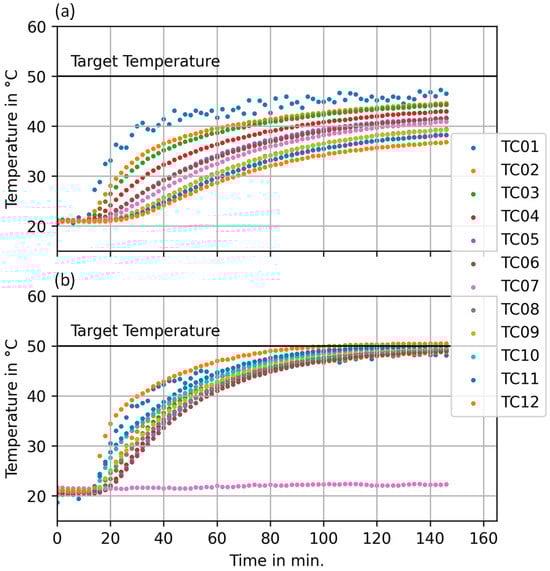 The results of temperature distribution with heating on one side and on both sides are shown in Figure 11. With one-sided heating, the target temperature of 50 °C is not reached after 120 min despite thermal insulation. With heating on both sides, the target temperature is reached after approx. 120 min and the temperature is distributed more homogeneously. In contrast to the other thermocouples, the TC01 thermocouple has not delivered uniform measured values. During the test with heating on both sides, thermocouple TC07 failed.