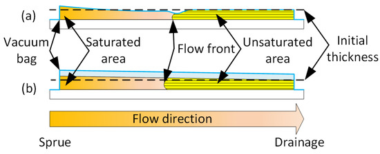 Schematic representation of the change in thickness during infusion. (a) Without caul plate. (b) With caul plate. Based on Chen et al. [19].