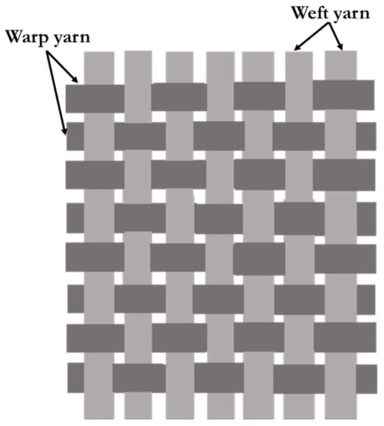 Presently, computer-aided designing techniques, in conjunction with finite element modelling principles, have developed novel directions for traditional weaving [], which include smart integrations for electronics, reinforcements, medical applications, 3D contour weaving in 2D platforms, and multi-axial weaving. In woven composites, warp yarns are the lengthwise ones that are held in tension on a frame or loom, while the weft yarns are drawn through and inserted over and under the warp yarns [], as illustrated for a plain weave fabric in Figure 1.