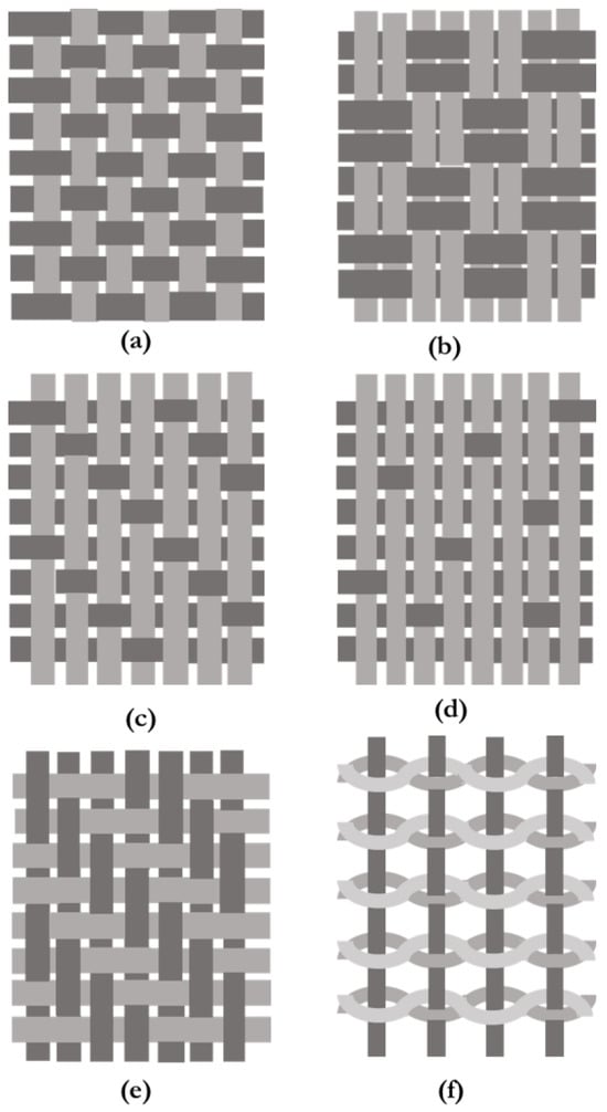 Schematics of different textile fabric structures: (a) plain weave, (b) basket weave, (c) 3 × 1 crowfoot, (d) 8 harness satin weave, (e) 2 × 2 twill weave, and (f) leno weave (redrawn from [,]).