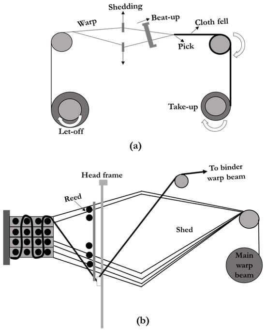 Schematics of conventional weaving processes: (a) 2D technique, (b) 3D weaving loom (redrawn from [,]).