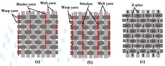 Schematic representations of typical (a) 3D woven, (b) 3D stitched, and (c) 3D woven z-pinned fabrics (Redrawn from []).