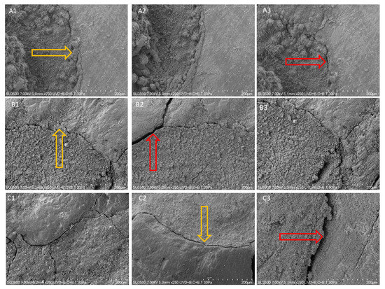 SEM micrographs showing the three different root repair materials at 250× magnification. The yellow arrows indicate the minimum gap between the RRMs and the dentin wall while the red arrows indicate the maximum gap. (A) EdgeBioCeramic RetroFill, (B) Endocem MTA, and (C) One-Fil PT.
