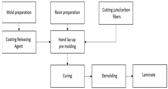 The hand layup technique is a popular and simple manufacturing method to create a composite. A general-purpose polyester Bisphenol A (BPA) resin from Huntsman Polymers was used as the matrix material. This resin is purchased from Renuka Enterprises in Mumbai, India. The physical characteristics of BPA are: Its molecular weight is 228.29 g/mol. It appears as a white solid at room temperature. The melting point of BPA is 158–159 °C and the boiling point is 220 °C at 4 mmHg. The density of BPA is 1.20 g/cm3. K6 hardener was used with a 10 wt.% addition to prepare the composite specimens. K6 hardener is largely an amine-based hardener. It reacts with epoxy resins and initiates a chemical reaction to change the liquid resin into a solid thermoset polymer. This hardener appears slightly yellow and generally has a low to moderate viscosity. The density is generally about 0.95–1.0 g/cm3. Before starting the process, jute fiber mats were cut to the required size. To reach the desired volume fraction, a specific amount of resin and fiber mat was used. The jute fiber fraction was kept at 35% by weight, while the epoxy was kept at 65% by weight. To make it easier to remove the composite, the supporting plate was thoroughly cleaned and a releasing agent was applied. The first layer of jute fiber mat (tensile strength 400–800 Mpa, Young’s modulus 10–30 GPa, density 1.3–1.5 gm/cm3, elongation at break 1.5–2.0%) was placed on the plate, and resin was added. Once enough resin was added to soak the fiber, a roller was used to remove any trapped air from the mat. This stacking process was repeated until all the estimated fiber mats and resin were added, with the jute fiber inclined at a 90° angle. After stacking, the upper plate was placed on top of the stack. The fiber and resin were protected with a polythene cover. The entire assembly was then placed in a hot compression device for 48 h while maintaining a temperature of 60 °C and applying a force of 100 kg/mm2 to remove any trapped air and to cure. Once the curing was complete, the excess fibers were trimmed off from all sides. The flow chart of the hand layup method used is represented in Figure 1. The same procedure was repeated to produce the sample specimen of carbon fiber (tensile strength 3500–7000 MPa, Young’s modulus 230–600 GPa, density 1.6–2.0 g/cm3, elongation at break 1.0–2.5%).