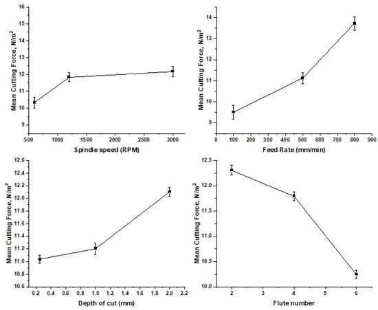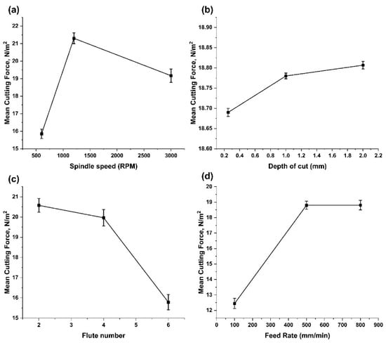 (a–d) Main effect plot for cutting force recorded during machining of carbon-epoxy composites.