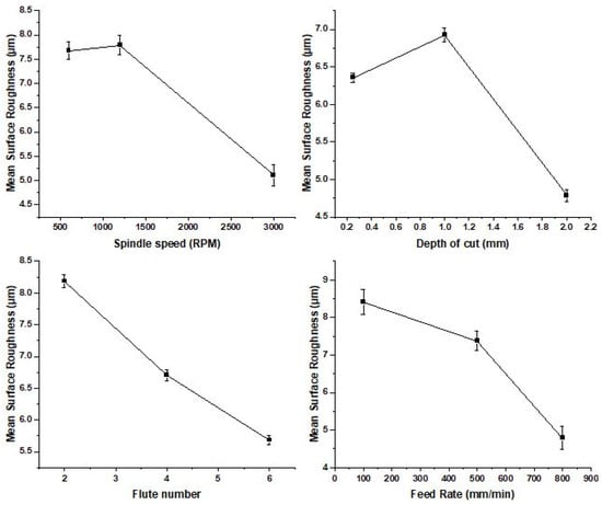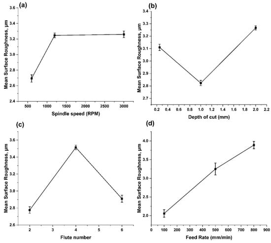 (a–d) Main effect plot for surface roughness recorded during machining of carbon-epoxy composites.