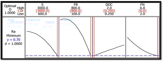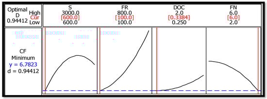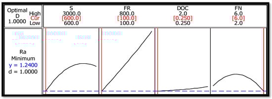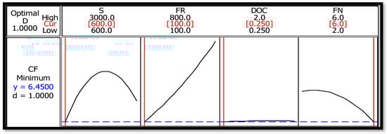 Figure 10 displays the RSM optimization plot to obtain the minimum cutting force required for milling carbon-epoxy composite. The optimum level of each parameter is displayed in red color inside the brackets. Based on the plot analysis, to achieve the lowest cutting force, we should fix level 1 for the parameters S, FR, and DOC and level 3 for the parameter FN. According to the RSM, the optimization plot obtained for the carbon-epoxy composite is given in Figure 11. Here, we should fix the parameters S, FR and DOC at level 1 and FN at level 3 to obtain the minimum surface roughness.