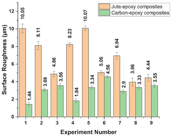 The comparative values of surface roughness during the milling of jute-epoxy composites and carbon-epoxy composites are represented in Figure 13. From Figure 13, it is clear that the roughness values generated in all the experiments during the carbon-epoxy composite are higher than the roughness values obtained for carbon-epoxy composites. The reason is that, compared to jute fibers, carbon fibers are harder. Because of this characteristic of the carbon fibers, during machining, the carbon fibers will be completely cut by the cutting tool and, due to their softness, the jute fibers will be torn/sheared rather than completely being cut; this shearing of the fibers produces a rough machining surface. The estimated average surface roughness for carbon-epoxy composite is 3.06 µm and for the jute-epoxy composite, it is 6.85 µm. The optimum combination of parameters obtained for the minimum cutting force for both jute-epoxy and carbon-epoxy composites is S = 600 rpm, FR = 100 mm/min, DOC = 0.25 mm, and FN = 6.