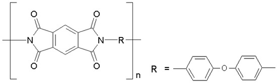 Polyimides are characterized by high resistance to atmospheric aging and low temperatures. They are non-toxic, have low smoke emissions, and self-extinguish when removed from the flame. A feature of polyimides is the ability to maintain mechanical and electrical insulating properties during long-term operation in a wide temperature range (from −190 °C to +300 °C) [25,26]. When producing polyimide compositions, the materials are pressed at 360–400 °C and pressure up to 100 MPa. Under these conditions, the final cross-linking of the polymer occurs and a tensile strength of up to 100 MPa is achieved in the temperature range from −196 to +300 °C [26]. Among all known polymers, polyimides have the highest radiation resistance to high-energy radiation (up to 108 Gy) [27,28]. In conditions where most other polymers are completely destroyed, subtle changes occur in polyimides. At a dose of γ-irradiation of 10,000–20,000 Mrad, the strength of polyimides practically does not decrease, and only a slight decrease in elasticity is noted [29]. The energy consumption required for one act of breaking and cross-linking for polyimide macrochains is approximately 4 times greater than for polystyrene [30].