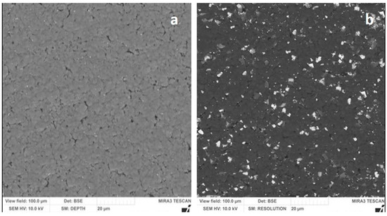 Based on these components, a polymer composite material with different boron content was obtained by direct hot pressing, and its physical and technical characteristics were determined. At the stage of preliminary mixing of the components, the method of their joint dispersion in a jet-vortex mill of the VSM-10 model was used [43,44,45]. The method of joint dispersion ensures not only mechanical activation of the surface of the particles of the polymer binder and filler but also helps to achieve high homogeneity of the distribution of the filler in the binder, eliminating the possibility of the formation of agglomerates [46,47,48,49]. Hot pressing of the components was carried out on a PSU-50 hydraulic press at a specific pressure of 80 MPa using a steel mold with constant heating and holding at a temperature of 350–360 °C. Pressing a viscous-fluid mixture at high pressure ensures high shear strains and uniform distribution of amorphous boron particles in the polyimide polymer melt [50]. The photographs of the microstructure of the pressed polyimide powder and the polyimide composite with an amorphous boron content of 5 wt.% obtained by scanning electron microscopy (SEM) on a Quanta 600 FEG scanning electron microscope (FEI Company, Hillsboro, OR, USA) are shown in Figure 2. The pressed polyimide press powder has a continuous globular structure with globule sizes of 0.5–1.0 μm (Figure 2a). The polyimide composite is characterized by a fine-grained structure (Figure 2b). A uniform distribution of amorphous boron microparticles in the polyimide matrix is observed. No microcracks or cavities were detected in the composite structure.