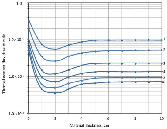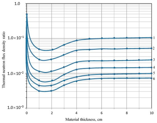 The ratio of thermal neutron flux densities for a polyimide composite with different boron content and polyimide without boron in composition with lead: 1—0 wt.% B; 2—1.0 wt.% B; 3—2.0 wt.% B; 4—3.0 wt.% B; 5—4.0 wt.% B; 6—5.0 wt.% B.
