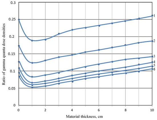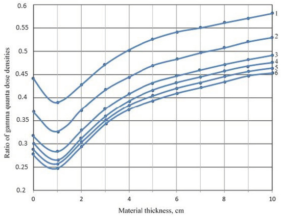 Ratio of gamma quanta dose rates for a polyimide composite with different boron content and polyimide without boron in composition with lead: 1—0% B; 2—1.0% B; 3—2.0% B; 4—3.0% B; 5—4.0% B; 6—5.0% B.