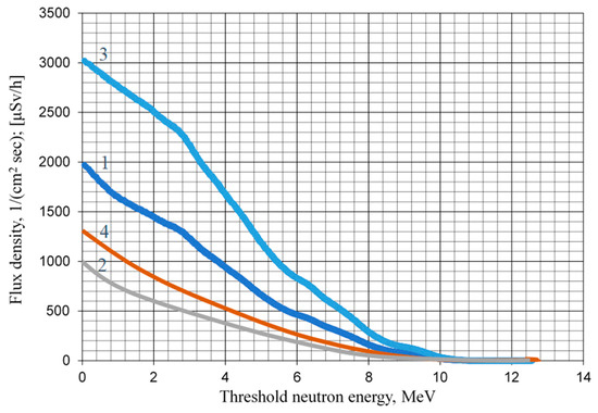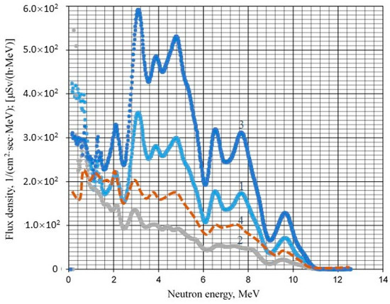 Integrated neutron energy spectrum and neutron dose rate spectrum of a Pu-Be source behind a protective polyimide composite with an amorphous boron content of 3 wt.%: 1—integral neutron spectrum of a Pu-Be source; 2—integrated spectrum of neutrons from a Pu-Be source behind a polyimide composite with boron 10 cm thick; 3—integral spectrum of the neutron dose rate of the Pu-Be source; 4—integral spectrum of the neutron dose rate of the Pu-Be source behind a composite with boron 10 cm thick.
