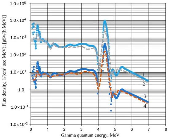 Differential energy spectrum of gamma radiation and dose rate spectrum of gamma radiation from a Pu-Be source behind a protective polyimide composite with an amorphous boron content of 3% wt.: 1—energy spectrum of a Pu-Be source; 2—energy spectrum of a Pu-Be source behind a polyimide composite with boron 10 cm thick; 3—energy spectrum of the Pu-Be source dose rate; 4—energy spectrum of the dose rate of a Pu-Be source behind a polyimide composite with boron 10 cm thick.