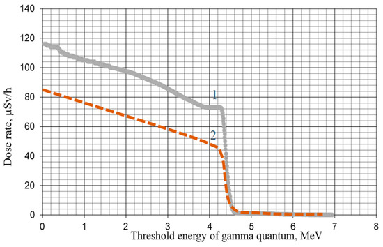 Integrated energy spectrum of the dose rate of gamma quanta and the energy spectrum of the dose rate behind the polyimide composite with an amorphous boron content of 3% wt.: 1—integral energy spectrum of the dose rate of the Pu-Be source; 2—integral energy spectrum of the dose rate of a Pu-Be source behind a polyimide composite with boron 10 cm thick.