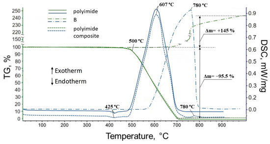 Our analysis of the presented data shows that pure polyimide and polyimide composites are thermally stable up to 425 °C without showing any mass loss on the TG curve. This temperature corresponds to the beginning of the thermal destruction of the polymer. The temperature of 607 °C corresponds to the maximum rate of thermal destruction, which is accompanied by a pronounced exothermic effect. The completion of thermal destruction of the polymer occurs at a temperature of 680 °C.