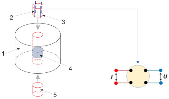 Four-point van der Pauw method of conductivity determination: 1—glass cylinder, 2—platinum/rhodium contact wires, 3—glass piston with incorporated platinum electrodes, 4—powder sample, 5—glass support. The DC voltage, U, was applied on the tip electrodes placed on the perimeter of the cylindrical sample base and the passing current, I (parallel with the bases) was recorded. Potential polarization effects and inhomogeneity issues were reduced by switching of electrodes.