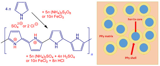 Conducting polymers are prepared by the chemical or electrochemical polymerization of respective monomers. The former takes place in water and exploits a variety of inorganic oxidants. In the present study, the oxidation of pyrrole to polypyrrole used the most common ammonium peroxydisulfate [11,12,15,26] and iron(III) chloride [13,18] (Figure 2). The ferrite surfaces immersed in the aqueous reaction mixture become coated with thin polymer films of submicrometer thickness [45]. The hydrophobic oligomers generated in the early stages of monomer oxidation adsorb at available interfaces and initiate the brush-like growth of polymer chains. This results in the coating of ferrite microparticles with polypyrrole. Any polypyrrole produced outside ferrite microparticles accompanies them, and the final product is thus composed of core–shell, polypyrrole-coated ferrite microparticles dispersed in polypyrrole matrix (Figure 2).