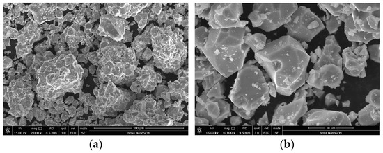 The morphology of ferrite resembles a crushed stone-like material (Figure 3) with particles of irregular shape, and particle size of units to tens micrometers with a broad size distribution. The original particles are accompanied by free polypyrrole (Figure 4). Some polypyrrole globules also adhere to the coating.