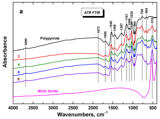 ATR FTIR spectrum of polypyrrole prepared in absence of ferrite (Polypyrrole in Figure 5a) corresponds to the protonated form of polypyrrole [46]. It exhibits the main bands with local maxima situated at 1540 cm−1 (C–C stretching vibrations in the pyrrole ring), 1458 cm−1 (C–N stretching vibrations in the ring), 1287 cm−1 (C–H and C–N in-plane deformation modes), 1161 cm−1 (breathing vibrations of the pyrrole ring), 1090 cm−1 (breathing vibrations of pyrrole ring), 1035 cm−1 (C–H and C–N in-plane deformation vibrations), 964 cm−1 (C–H out-of-plane deformation vibrations of the ring), and at the maxima at 768 and 664 cm−1 (C–C out-of-plane deformation vibrations of the ring) [47]. A maximum at 1695 cm−1 was assigned to the carbonyl group created by the nucleophilic attack of water on pyrrole ring during the preparation [19]. The shape of spectra of polypyrrole/MnZn ferrites did not change with increasing amount of ferrite in the reaction mixture. A broad absorption polaron band at wavenumbers above 2000 cm−1 corresponds to the polarons within the chain structure, which act as charge carriers that are responsible for the electrical conduction. This band is more pronounced for polypyrrole prepared in absence of ferrite. The presence of ferrite is demonstrated by a sharp peak situated at 519 cm−1 (Figure 5a), which becomes reduced as the amount of deposited polypyrrole increases.