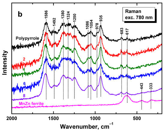 Laser excitation wavelength 780 nm used in the Raman scattering is in resonance with the energy of polarons in the protonated polypyrrole. In Raman spectra of polypyrrole prepared in the absence of ferrite (Polypyrrole in Figure 5b), we detect the bands of polypyrrole with local maxima at 1586 cm−1 (C=C stretching vibrations of polypyrrole backbone) and 1492 cm−1 (C–C and C=N stretching skeletal vibrations), two bands of ring-stretching vibrations at 1380 and 1324 cm−1, a band at 1250 cm−1 (antisymmetric C–H deformation vibrations), and a double-peak with local maxima at 1086 and 1054 cm−1 (C–H out-of-plane deformation vibrations, the second became sharper during deprotonation [19,46]. The Raman spectroscopy is the method of the surface-sensitive characterization. Due to the resonance enhancement of the Raman spectrum of polypyrrole the presence of ferrite is not detected in the Raman spectra of ferrite/polypyrrole composites, thus confirming the complete coating of microparticles with conducting polymer.