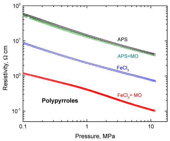Electrical properties of polypyrrole depend on the conditions of polymer synthesis, e.g., the oxidant type and resulting morphology that can be affected by the presence of organic dyes [20], typically methyl orange (Figure 6). The double-logarithmic presentation of polypyrrole resistivity on pressure is about linear. Polypyrrole prepared with ammonium peroxydisulfate has higher resistivity that that produced with iron(III) chloride. Although the addition of methyl orange had marginal effect on resistivity with the former oxidant, it led to a marked decrease in the resistivity with the latter, i.e., the conductivity increased. This is the result of the conversion of globular morphology to nanotubes. An earlier study proved that with peroxydisulfate oxidant, the occurrence of nanotubes was rare, and they were always accompanied by the globular form [47], while with iron(III) chloride nanotubes clearly dominate [19] (Figure 4). The nanotubular morphology is thus responsible for the enhanced conductivity.