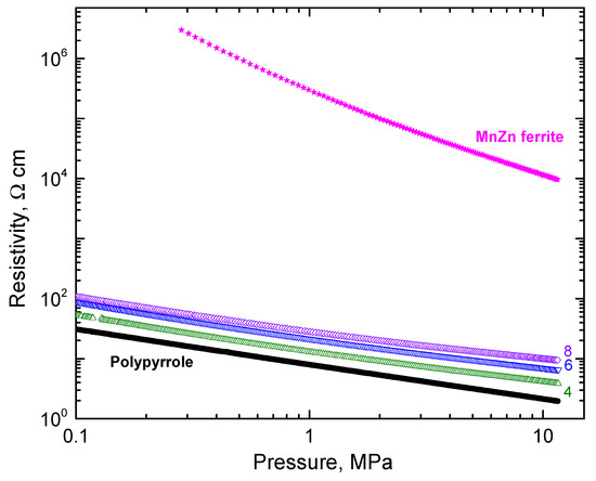(1) The conductivity of composites moderately decreased with increasing content of ferrite in the samples. This is also easily visible in the corresponding resistivity vs. pressure curves (Figure 7). Please note that the resistivity of ferrite is four orders of magnitude higher compared to polypyrrole. As ferrite microparticles are coated with polypyrrole, the contact of ferrites cores is prevented (Figure 2), and the conductivity is determined exclusively by continuous polypyrrole matrix. The introduction of ferrite reduces the volume fraction of polypyrrole matrix in the composite and the resistivity only marginally increases in the response (Figure 7).