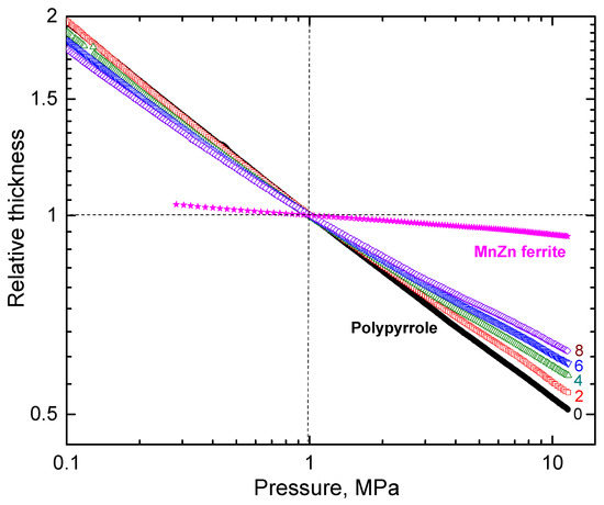 Pressure dependence of relative sample thickness for polypyrrole/MnZn ferrite composites shown in Figure 7.