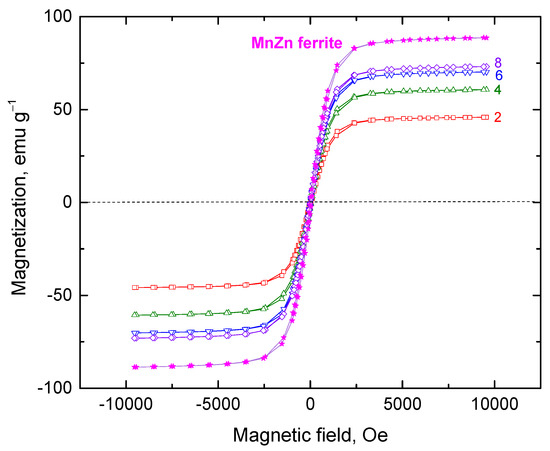 As expected, the highest magnetization 88.6 emu g−1, (Table 3, Figure 9) was achieved with neat MnZn ferrite. Since polypyrrole itself does not display magnetic properties, the saturation and remanence magnetization of composite materials should be governed by the amount of ferrite in the sample, which corresponds well with obtained values. From the coercivity and remanence values and the shape of the curve, it can be seen that the composites are magnetically soft materials as expected. No significant differences were observed for coercivity of the individual particles. The coating of ferrite with conducting polymer does not have any effect on the magnetostatic properties of ferrite cores. The analogous studies of MnZn ferrite coated with polyaniline [38,48], however, proved that the formation of a conducting polymer overlayer on the surface of a MnZn ferrite microparticles modified the character of the frequency dispersion of the magnetic permeability. The changes in the magnetic properties were due to the change of the boundary conditions of the microwave field at the interface between the ferrite particle and the polymer coating. Such effects are likely to occur also with polypyrrole-coated ferrite and they would become of importance when applied in electromagnetic interference shielding compositions.