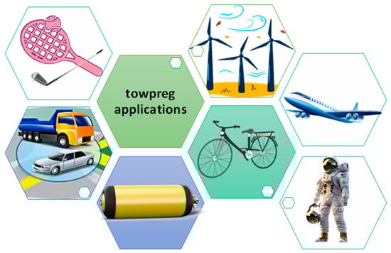 The potential applications of towpregs are numerous. They can be suitable to produce tanks for storage, transport or distribution of hydrogen, pressure vessels, dynamically loaded components like springs, shafts, pipes, various sporting goods and goods for the energy sector, etc. (some of these applications are given in Figure 1). As the technology continues to overcome the current barriers and meets future challenges, it is likely that even more advanced and innovative applications of carbon fiber towpreg will be seen in the near future. More particularly, carbon fiber towpreg, as a high-performance material, has revolutionized the manufacturing industry, providing high-tech performance and lightweight and durable material that can be used in a wide range of applications—in the aerospace, maritime, automotive, sporting goods and other sectors.