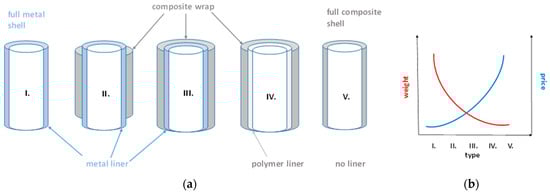 (a) Classification of pressure vessels with different shell/liner configurations. (b) Weight and price aspects vs. vessel type.