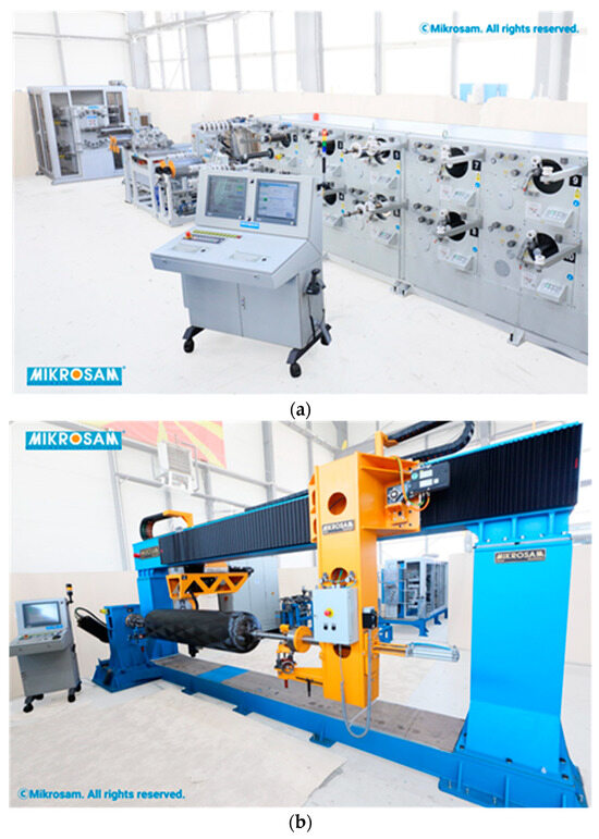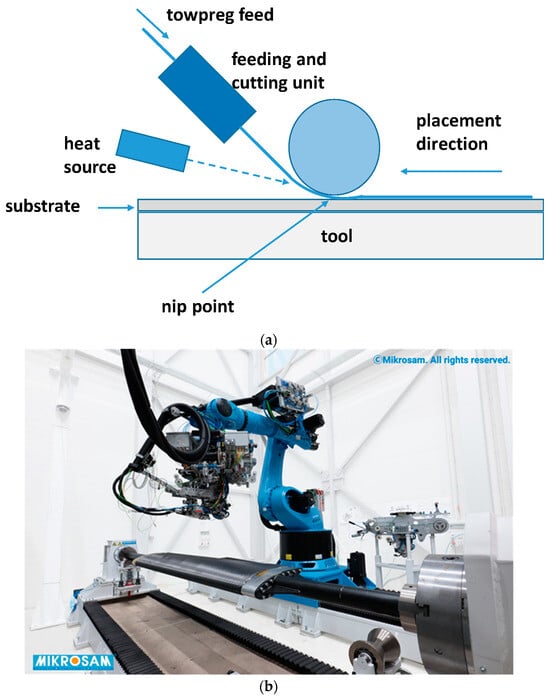 (a) Automated fiber placement technology (AFP). (b) AFP equipment in process of customized part (Mikrosam, Prilep, N. Macedonia, https://www.mikrosam.com/product/automated-fiber-and-tape-placement/, accessed on 19 September 2024).