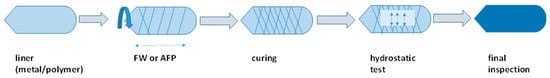 The composite overwrap functions as the backbone of the storage system and provides strength for pressurized gas storage. The composite thickness distribution, mandrel geometry, winding pattern, winding angle and manufacturing technique affect the load-bearing characteristics of the reinforcing fibers supported by proper load transfer in the resin medium. Unidirectional fiber reinforced composites are orthotropic materials that mainly bear loads in longitudinal directions. The winding angles, sequence of layers and individual layer thicknesses at different dome locations are arranged to target proper structural strength in all directions. The winding angles/layer sequence are predetermined based on designed pressure and layer thicknesses. The orientation of fibers and their location in the composite strongly allows shaping its strength for a given set of possible loads, while the failure of the vessel depends on the material properties, the vessel design, the manufacturing and the loading conditions. Due to its fast speed, it is suitable for large-scale production with applications in several industries, providing products with high fiber content (e.g., 60% or more) and excellent mechanical properties [35]. To overcome many shortcomings of traditional wet filament winding (presented in Section 2.2.1, Table 2), significant progress in the “towpreg” technology today has been made. Namely, “dry filament winding,” which uses towpregs is an alternative to wet technologies is novel and high-tech because towpregs are the materials that solve the reproducibility, reliability and homogeneity issues occurring in the traditional wet winding process [18].