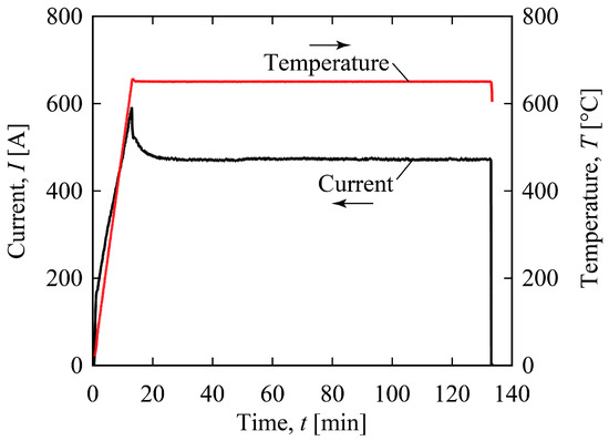 Typical changes in the current and temperature during sintering. These changes were measured when the specimen that included Ti fibers with an aspect ratio of 32 was sintered, and the same trend was observed for other specimens.