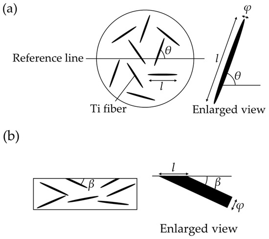 It is well known that the short fiber direction affects the strength and Young’s modulus of a short-fiber-reinforced composite. Hence, the direction of the Ti fibers in the porous Ti was examined to investigate the mechanical properties. Figure 3 shows schematic diagrams of the transverse section (top or bottom surface) and the longitudinal section of the porous Ti. The Ti fibers could be clearly observed at the top and bottom surfaces but not at the longitudinal section due to the boundary between the matrix and Ti fibers being ambiguous. Hence, the three-dimensional orientation of each Ti fiber was estimated by measuring its angle and size at the top and/or bottom surfaces as follows: First, a reference line was arbitrarily drawn on the surface, as the disk-shaped compact had no geometric orientation. The fibers at the surface were cut during the surface processing so that their cross-sections exhibited an ellipticity that depended on their direction. Under the assumption that each fiber was straight, the major axis of the elliptical section was parallel to the section’s direction at the surface, and hence, the in-plane angle θ was defined as the angle between the reference line and the major axis. The out-of-plane angle β was calculated based on the geometrical relationship between the length of the major axis and the fiber diameter, as shown in Figure 3b. It is given by