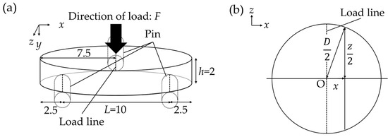 where L, F, δ, D, and h are the span, applied load, displacement at the load point, specimen diameter, and specimen height, respectively. Note that Izo represents the second moment of the area at the center of the specimen. The bending stress σ at the bottom surface of the specimen was distributed based on the bending moment and the second moment of the area. Under the assumption that the specimen was elastic, the stress at the tensile surface (bottom surface) is given by