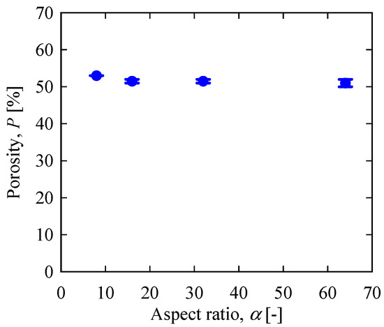 Figure 5 shows the relationship between the porosity of the short-Ti-fiber-reinforced porous Ti and the aspect ratio of the short Ti fibers. In this figure, the plotted points and scatter bars denote the average and the maximum and minimum values obtained from two specimens used for each condition, respectively. The porosity was approximately 50%, irrespective of the aspect ratio. It was confirmed that the volume fraction of desalination exceeded 95% in all the specimens and that each specimen had an open-cell structure.