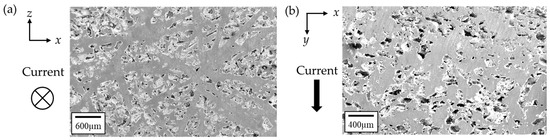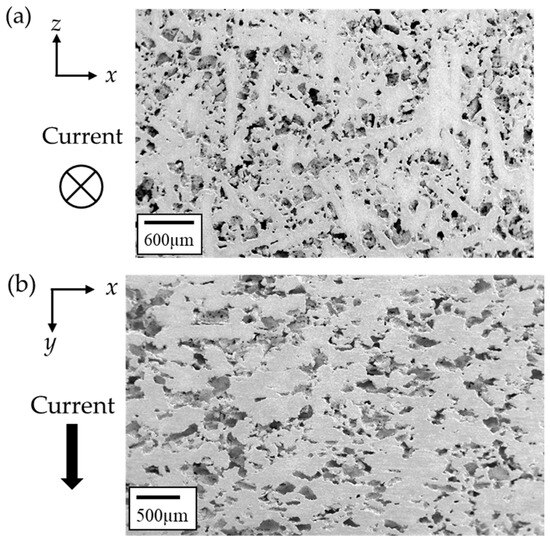 Microstructure of the short-Ti-fiber-reinforced porous Ti with an aspect ratio of 64. (a) Top surface (transverse section) and (b) longitudinal section. The direction of the pulse current during the SPS is shown.
