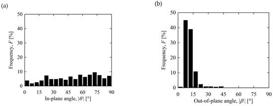 Distributions of the short Ti fibers in the (a) in-plane and (b) out-of-plane directions. The angles were measured in the range of −90° to +90°. It is not necessary to distinguish between positive and negative values to show the deviation from the reference line. Therefore, the angles are shown as absolute values.