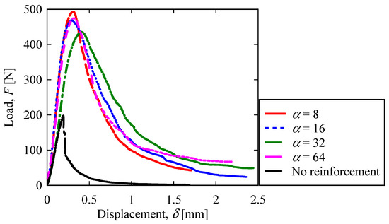 Figure 9 shows typical load–displacement curves of the porous Ti with various fiber aspect ratios. In this figure, the load–displacement curve of porous Ti with no reinforcement is shown for comparison. Note that the porosity of the porous Ti was set to be constant at 50%, as shown in Figure 5. Irrespective of the aspect ratio, each curve was linear at the early stages of loading and then became nonlinear. After the load reached its maximum value, it gradually decreased. The final point of each curve corresponds to the end of the testing. The specimen was not separated in this condition.