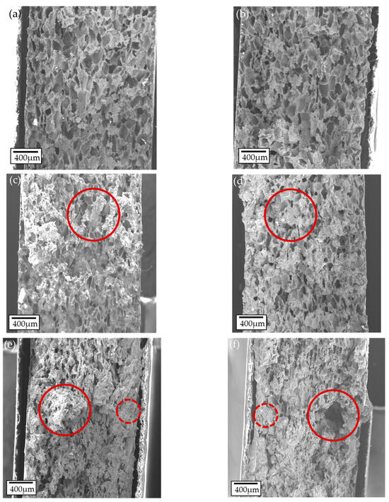 Fracture surfaces of the porous Ti. (a,b) show both fracture surfaces of the uniform porous Ti. (c,d) and (e,f) show both fracture surfaces of the porous Ti with aspect ratios of 8 and 64, respectively. The solid and dashed circles show the fiber pull-out and fiber breakage, respectively. More fibers tended to break as the aspect ratio increased.