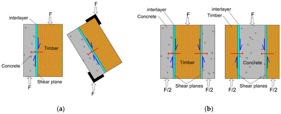 Connection test specimens: (a) two-member test method; (b) three-member test method, left: concrete–timber–concrete, right: timber–concrete–timber.