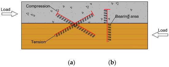 Screw connection in TCC systems: (a) cross pair; (b) perpendicular to the shear plane.