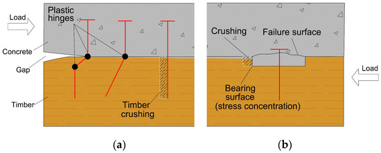 The models used for calculating the strength of TCC connections generally come from the Johansen or European Yield Theory for timber-to-timber or timber-to-steel connections [43], as no specific model for the strength of TCC connections has been introduced. The primary approaches adopted for the strength models generally assume that concrete behaves as a completely rigid component while also considering different failure modes in both the timber and the fasteners [10,44]. Kavaliauskas et al. [45] extended Johansen’s Yield Model, considering failure modes in wood and screws while assuming the screw in concrete to be rigid. Although the model aligned with experimental results, the failure modes differed, likely due to limited fastener ductility and the influence of screw inclination on timber strength. In the case of using LWAC with a smaller modulus of elasticity, Appavuravther et al. [27] recommended considering concrete failure as well.