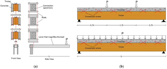 In long-term creep experiments, various methods have been used to apply the sustained load. For connection tests, the most common method utilizes a lever system to amplify the load applied to samples, which allows for simultaneous loading of multiple test specimens in a series, Figure 4a [8,25,62]. Linear variable differential transformers (LVDT) or dial gauges are usually used to measure the relative slip between timber and concrete. Long-term testing of TCC beams is usually conducted using the same test setup as short-term bending tests, often using a four-point bending method with loads applied at one-third points of the span. Also, in some studies, a uniformly distributed load (UDL) was applied as the long-term load. In most long-term tests, the tests concluded when no significant changes in creep coefficient or mid-span deflection were detected [8,63].