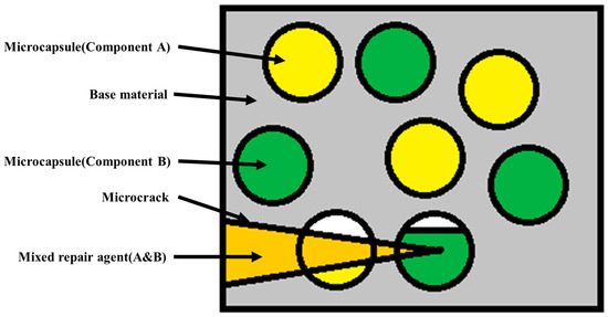 Microcapsulated self-healing technology is the most widely used external self-healing technology. It encapsulates restorative agents into tiny capsules (i.e., microcapsules) with film forming materials to achieve self-healing [1,2,16]. In 2001, White et al. widely publicized the principle of microencapsulated self-healing technology in Nature, ushering in a wave of the development of self-healing materials. The repair agent is encapsulated and embedded into the matrix via technical means. When the matrix material is damaged, the repair agent is released and cross-linked in the damaged area to complete the repair of the damage.